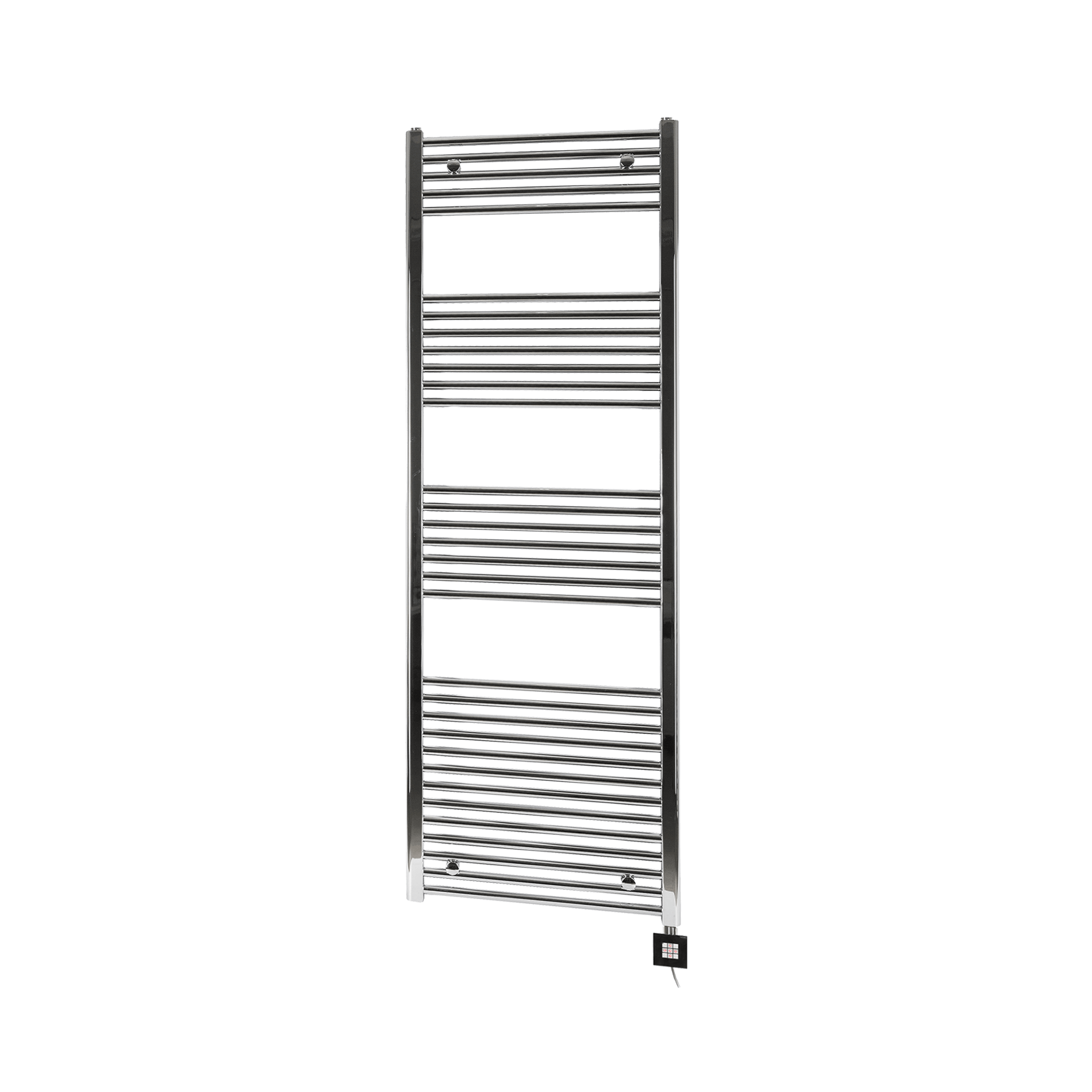 Der Handtuchtrockner HR von Technotherm ist ein elektrisch betriebener Badheizkörper mit integrierter Heizpatrone in einem Wärmeträgerfluid. Nach dem Einschalten erwärmt die Heizpatrone das Fluid und damit den Heizkörper, der die Wärme als angenehme Strahlungswärme an den Raum und direkt an die aufgehängten Handtücher abgibt. Das integrierte Thermostat mit LED-Anzeige regelt die Temperatur präzise von 30 bis 60 °C, ein 2-Stunden-Timer schaltet das Gerät automatisch ab. Die Mikroprozessorsteuerung sorgt für sicheren Betrieb mit Überhitzungsschutz. Die chromfarbene Ausführung bietet identische Technik in elegantem Design und eignet sich mit nur 40 cm Breite und ca. 80 cm Höhe ideal für schmale Wandflächen.